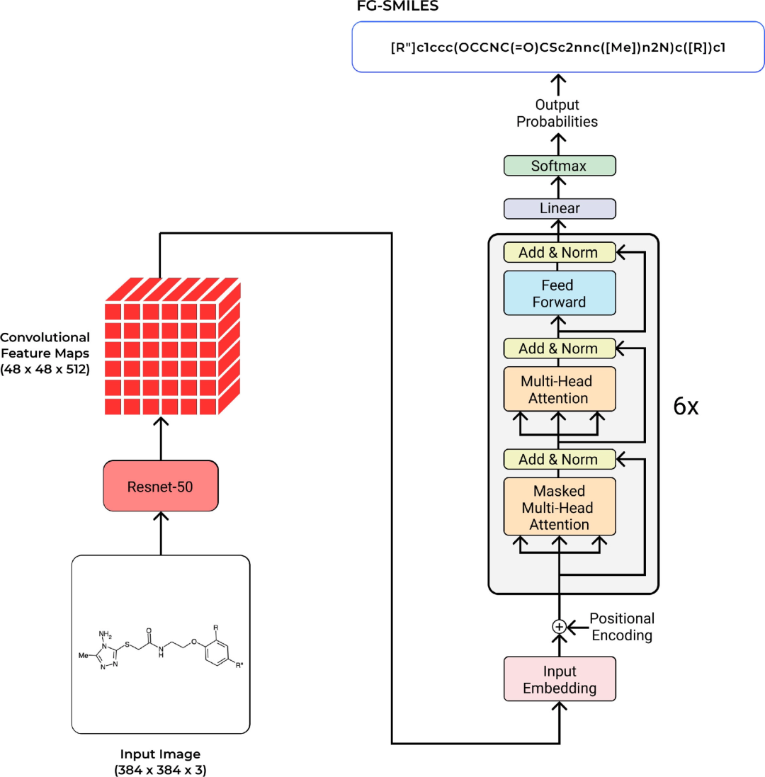 Img2SMILES 模型的输入形状为 384x384。研究人员使用 ResNet-50 作为 CNN 块。ResNet 模块的输出形状为 2048x12x12。Transformer 解码器的其他参数取自经典架构。