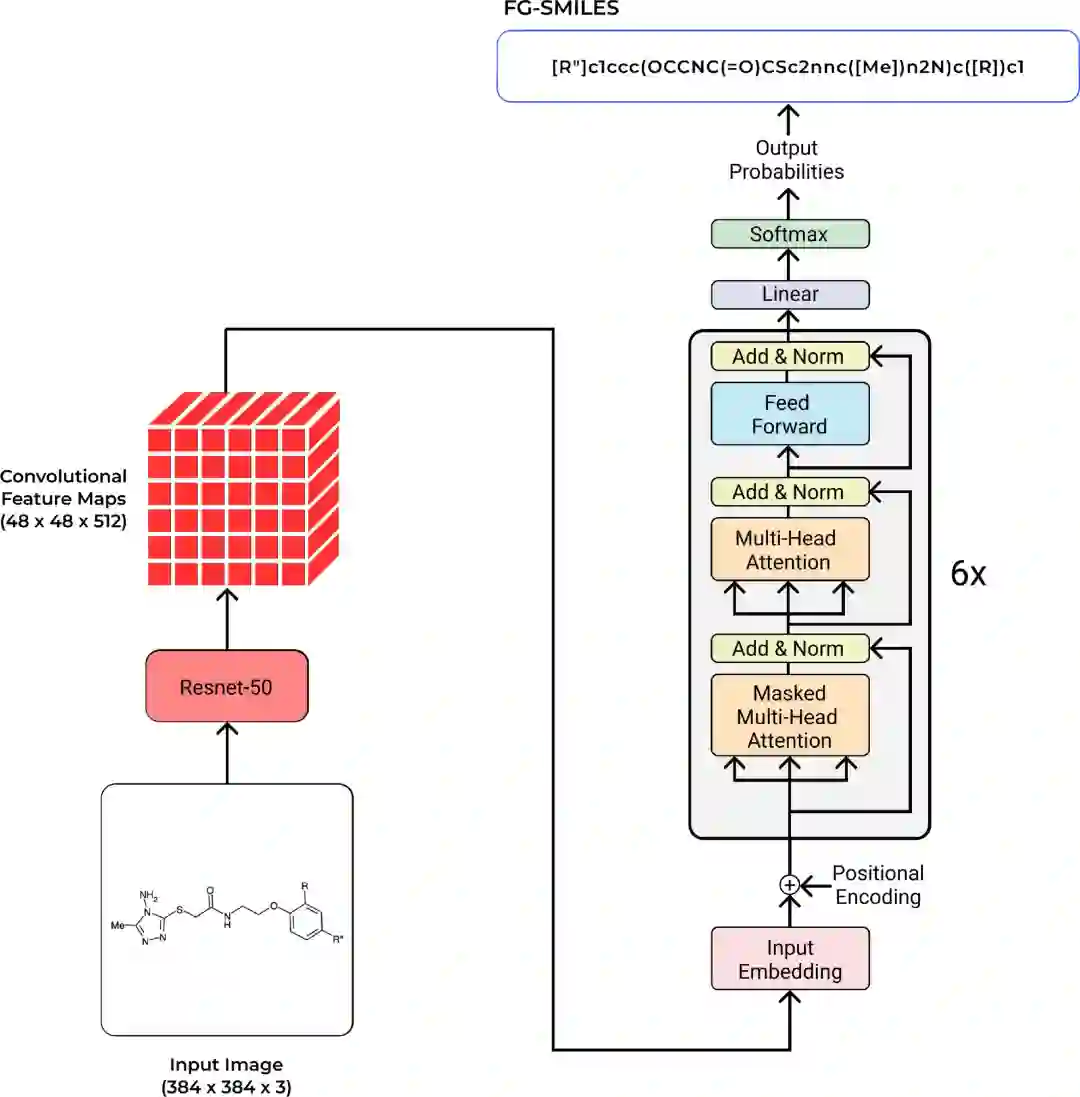 Transformer 是谷歌团队最初提出的用于神经翻译的架构。然而,该架构及其修改在许多其他任务中表现出出色的性能,例如:在化学中,Transformer 被应用于有机反应结果的预测,SMILES 和 IUPAC 名称之间的转换。可以看出,基于 Transformer 的架构的性能通常高于基于 RNN 的方法。这一观察促使研究人员实现了一个基于 Transformer 的引擎,用于光学识别化学结构。