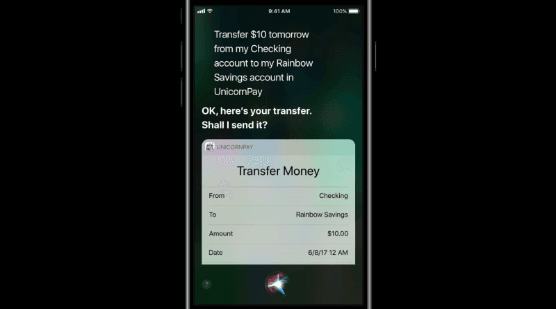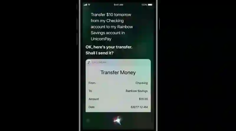 从 iOS 11 开始,通过使用应用程序工具包 SiriKit,Siri 就可以从你的 APP 中提取你的账户余额以及在账户间转账,而且 SiriKit 还将理财服务扩展到 Siri,实现 P2P 支付的能力。在 iOS 11 上的 Siri 还可以识别账户的昵称,并与用户谈论信用卡的奖励积分问题。