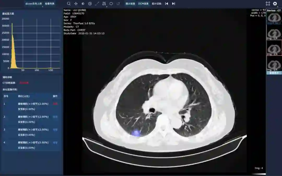 为医院影像科提供一个CT影像辅助诊断工具,该工具可以对COVID-19肺炎、其他病毒性肺炎及细菌性肺炎的六类典型病灶(磨玻璃影、实变、空腔空洞等)自动进行标注,呈现基线直方图,并给出新冠肺炎辅助判读结果预测。