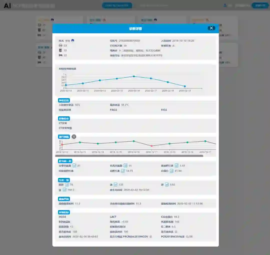 为临床医生提供一个新冠肺炎疑似/确诊患者医疗信息综合查询应用,展现患者新冠肺炎诊断所有相关的临床指征信息。并实时通过AI计算,预测患者的确诊几率和临床危重症几率。并可对各指征变化进行连续性监测,便于医生快速掌握患者患病情况,准确的采取对应的诊治措施。