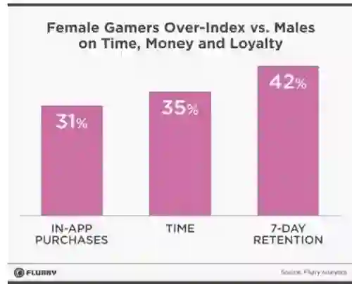 Flurry调查了自己平台上110万个移动设备的游戏,发现女性应用内购买次数比男性多31%。玩手游的时间也比男性多35%,而且平均一周内的游戏忠诚度也比男性高42%。