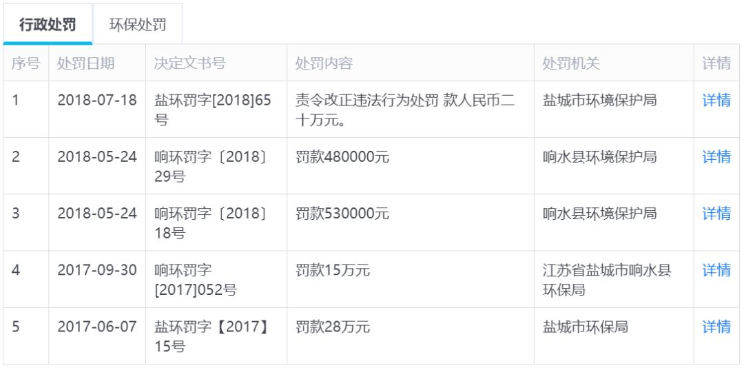 该化工厂还频频出现在当地环保处罚的名单上。启信宝查询显示,2016年至2018年,该公司累计被盐城市环保局、响水县环保局处罚7次,共处罚款179万元,原因包括逃避监管方式排放污染物,违反固体废物管理、大气污染防治管理、环境影响评价等多项环境保护管理制度。