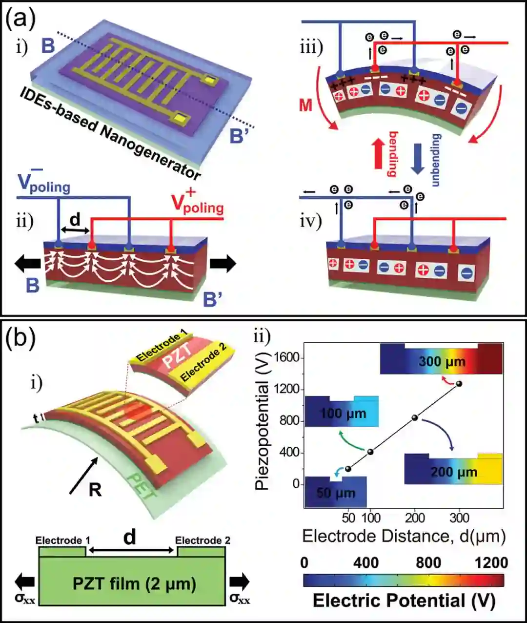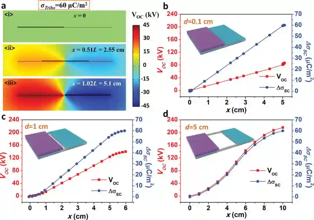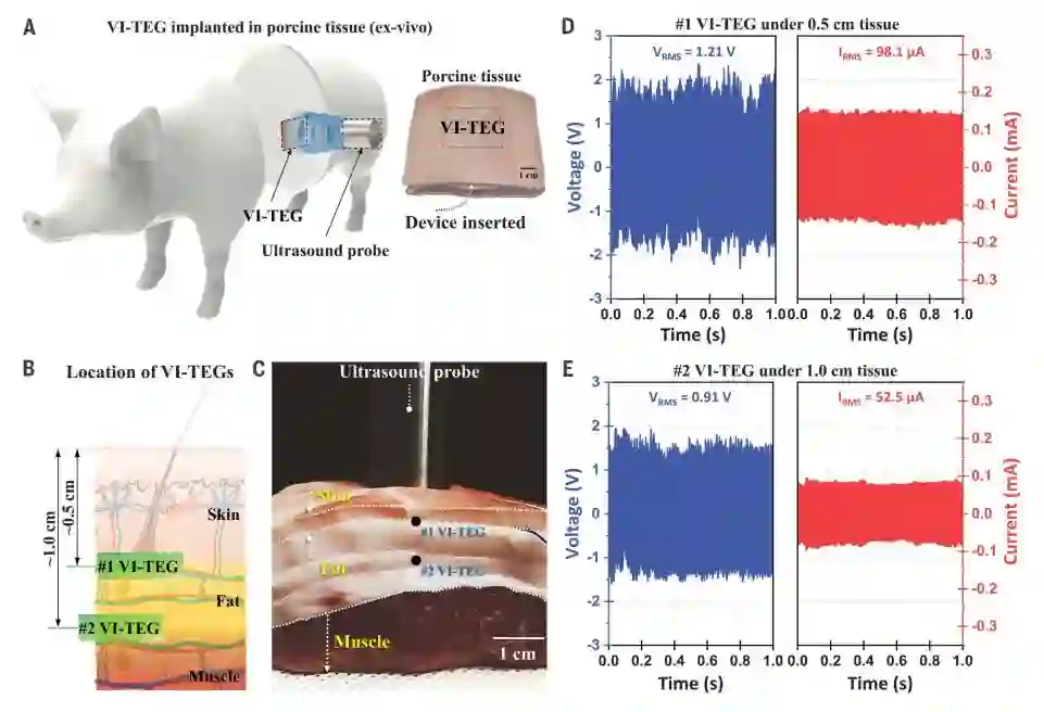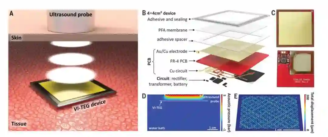 文章的图一展示了器件(VI-TEG)的工作示意图,基本组成和工作原理。摩擦发电器件被植入在皮下,通过在皮肤外施加超声波,器件就能输出电能。器件由多个部分组成,摩擦发电的部分是PFA 层和金/铜电极。PFA 层和金/铜电极接触后带负电,两层之间产生间距的变化就会输出交变的电流。最后作者还通过COMSOL仿真展示了声压的分布和器件PFA层在声场作用下的位移。从COMSOL仿真结果可以看到,声波主要被VI-TEG器件反射,不能透过VI-TEG,而VI-TEG中能产生相当大的位移,从而产生电能。通过仿真结果,直观明了的展示了器件工作的基本科学原理。