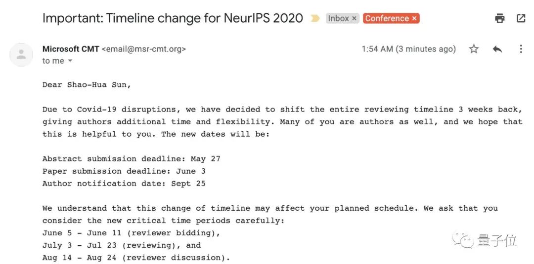 ICML组委会考虑到疫情出现之后人们的生活节奏被打乱,参会者需要调整生活节奏、照顾家人,因此大幅推后了时间表,投稿作者要到6月1日左右才能知道自己的论文是否入选,这比原计划推迟了1个月。