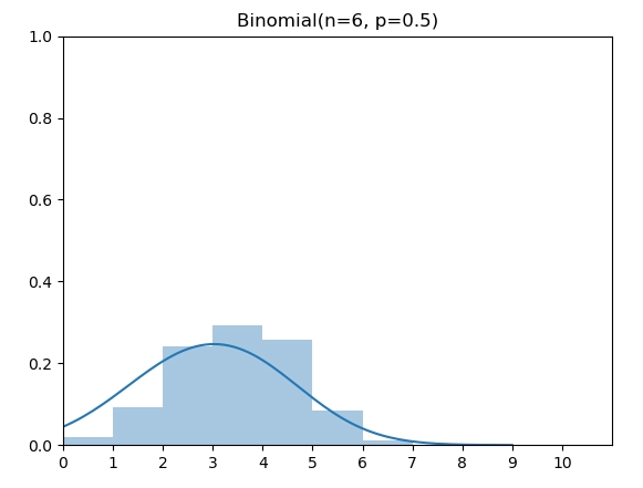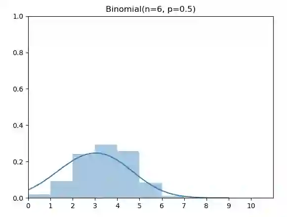 二项分布(Binomial Distribution)有两个参数 n 和 p,表示伯努利实验做n次后成功的次数。图中为 n=6,p=0.5的二项分布。