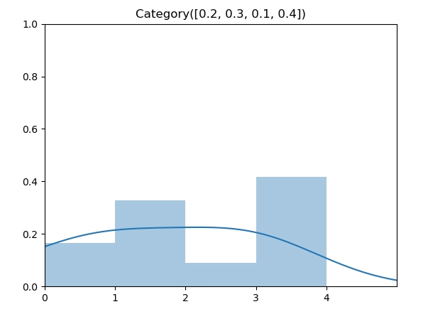 类别分布(Categorical Distribution)是在伯努利分布的基础上扩展到了多个点,每个点同样由参数指定了其概率,因此,其参数从 p 扩展到了向量 ,如图所示为 时的类别分布。