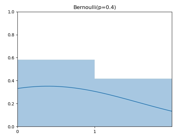 伯努利分布(Bernoulli Distribution)是support为0或者1的离散分布,0和1可以看成失败和成功两种可能。伯努利分布指定了成功的概率p,例如,下图是 p=0.4 的伯努利分布。