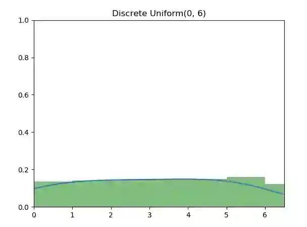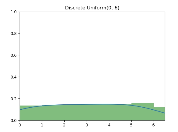 离散均匀分布(Discrete Uniform Distribution)的随机变量是最为基本的,图中为 [0, 6] 七个整数的离散均匀分布。算法实现为,使用 [0, 1] 之间的随机数 u,再将 u 等比例扩展到指定的整数上下界。