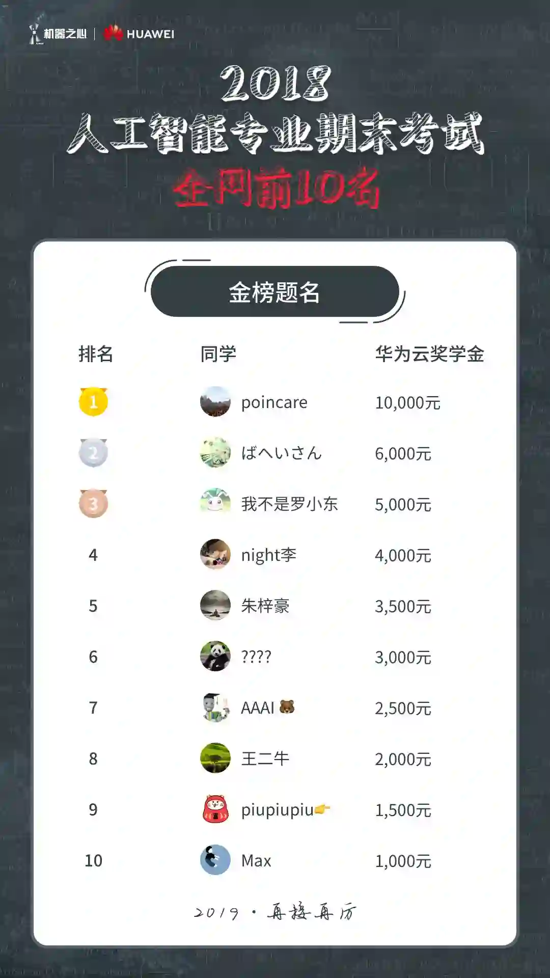 2018 年是人工智能迅猛发展的一年,从技术研究到产业应用都取得了阶段性成果,为了回顾本年度行业大事、检验各领域从业者的学习情况,我们于2018 年 12 月 25 日至 2018 年 12 月 31 日发起了人工智能专业期末考试,并设置 66666 元「华为云奖学金」,奖励本次考试中成绩优异的同学。现将本次期末考试的最终成绩公示如下: