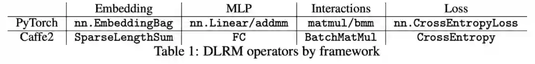 DLRM 实现所需要的相关接口在 PyTorch 和 Caffe2 中都有实现,见 Table 1。