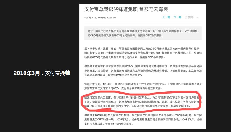 2010年,支付宝其实就是一个电商工具,服务淘宝支付,但当时发生了一件什么事儿呢?支付宝总裁被免职,媒体称马云曾批评其产品“烂到极点”,用户体验太糟糕,支付宝太保守,毫无进步。