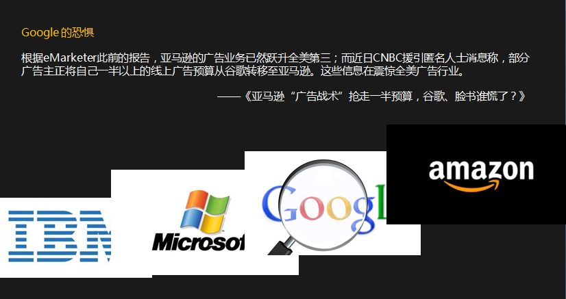 你看,IBM是一个硬件公司,微软是一个软件公司,Google是一个互联网服务的公司,但战争结束了吗?没有啊,Google现在最大的恐惧是什么?可能不是流量上跟他有竞争的Facebook,而是突然发现,广告主把预算都移走了。移到哪儿去了?移到了亚马逊去。