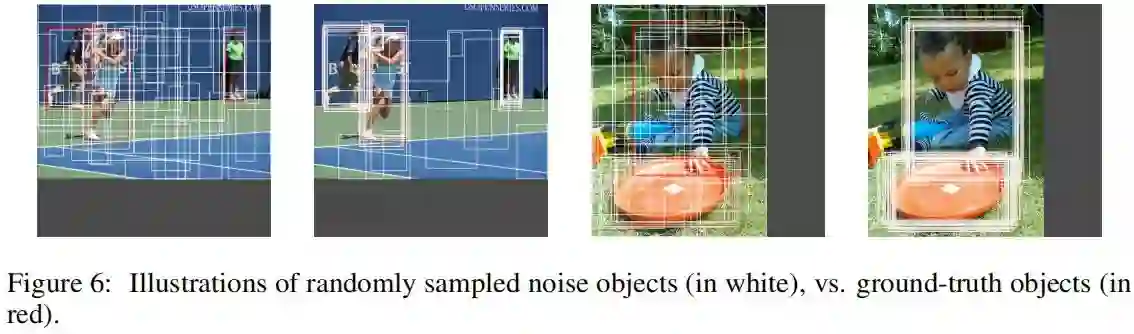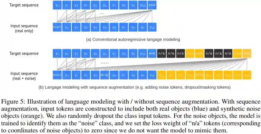 上图给出了合成噪声目标示意图,可以看到:合成噪声目标与真实目标会存在重叠。完成噪声目标合成与离散化后,我们将其添加到原始输入序列尾部;对于目标序列,我们设置噪声目标的目标token为noise类、坐标token为n/a,对应的损失权值为0,即 。