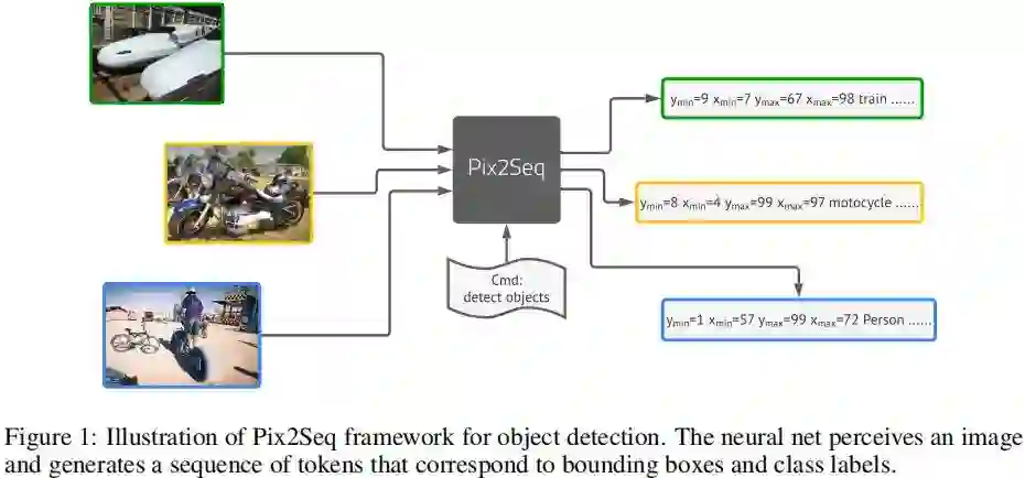 本文提出了一种简单而通用框架Pix2Seq用于目标检测,不同于已有显式集成先验知识的方案,我们将目标检测任务转换成了基于观测像素输入的语言模型任务 。关于目标的描述(比如边框、类别)将被描述为离散token序列,我们训练了一个神经网络去感知图像并生成期望的序列。