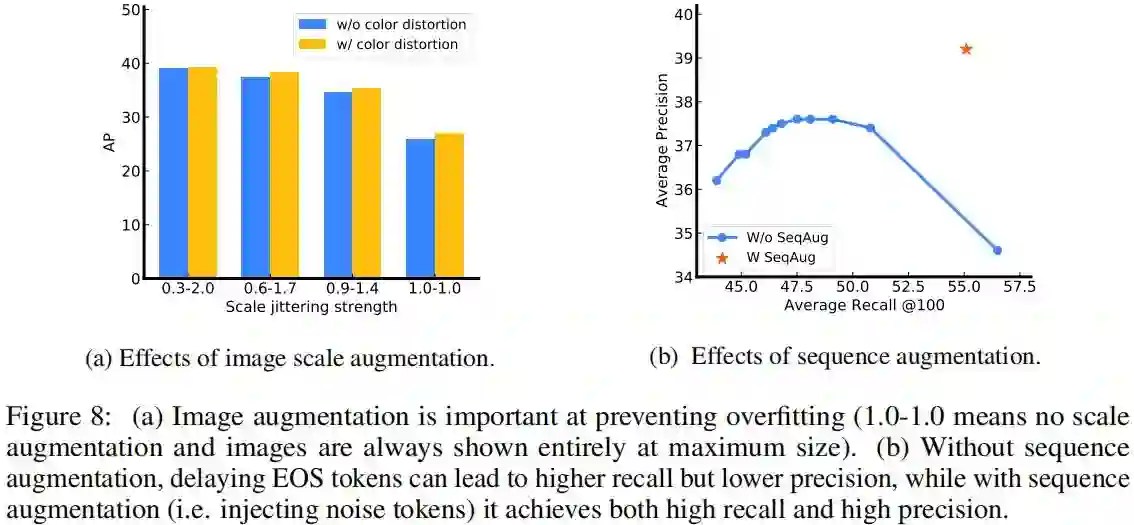由于召回率与准确率对目标检测均非常重要,为得到更高召回率,一个可能的技巧:通过人工降低似然延迟EOS的采样。然而,这会误检、重复检测问题。