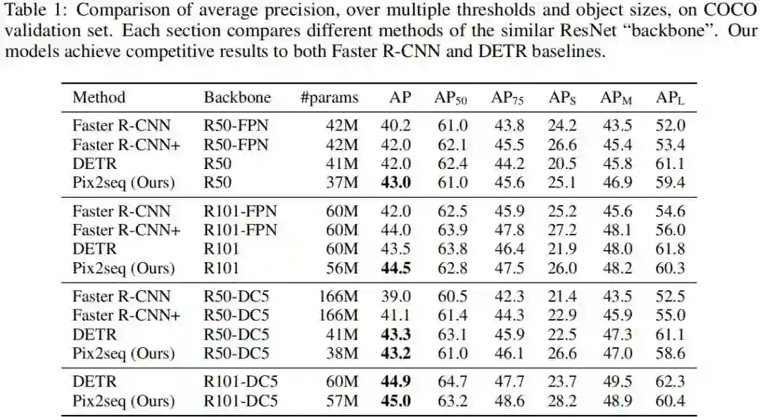 所提Pix2Seq取得了与基线方案相当的结果 ;