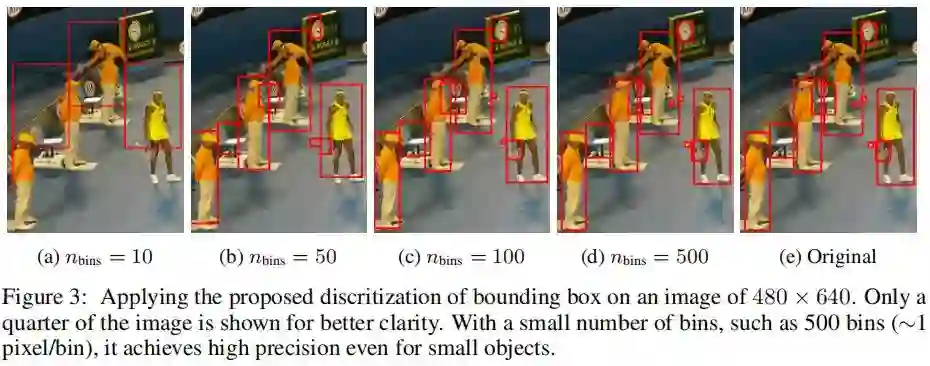 类别标签天然的可以表示为离线token,但边框不行。边框可以通过两个角点(比如左上、右下两个角点)确定,或者通过中心加宽高。我们对角点的 坐标进行离散化,具体来说,目标将被表示为五个离散token序列 ,每个连读角点坐标被均匀离散化到整数 ,c为类别索引 。我们对所有目标采用共享词表(vocabulary),故此表大小等于bins数+类别数。这种量化机制使得我们可以使用较小的词表取得高精度。比如, 大小图像仅需600bins即可达到零量化误差,这远小于32K词表的语言模型。下图给出了不同水平量化对于边框的影响。