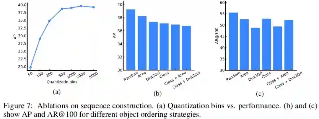 在前面内容中,我们将目标的描述转换为短离散序列,接下来,我们对多目标描述序列化以构建给定图像的单序列。由于目标的顺序不会对检测任务产生影响,我们采用了随机顺序策略 。我们同样探索了其他确定性顺序策略,但两者性能相当。