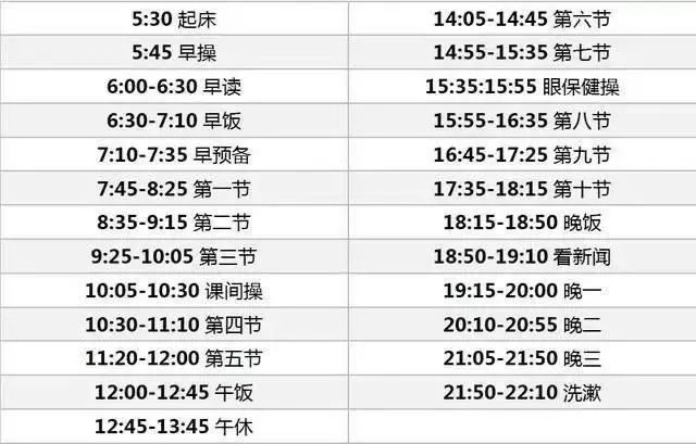在一份广为流传的衡中学生作息表中,可以看到,学校为起床、跑操、用餐、午休等等活动,都规定了严格而精确的时刻。据称,实际的时间安排要更加细化,如5点43分值日生离开宿舍、5点45分赶到集合地点跑操、6点38分高一学生吃早饭、18点40分~19点10分看录播的电视新闻等等。