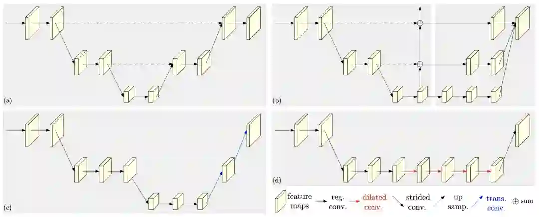 一共总结了两类 high-to-low 和 low-to-high 结构:以 Hourglass 为例的降分辨率和升分辨率完全对称的方式;以 Simple Baseline 为例降分辨率采用较重的分类基网络,升分辨率采用轻量的结构,这种轻量的方式包括:反卷积、空洞卷积。分别对应下图 (a)、(b)、(c)、(d):