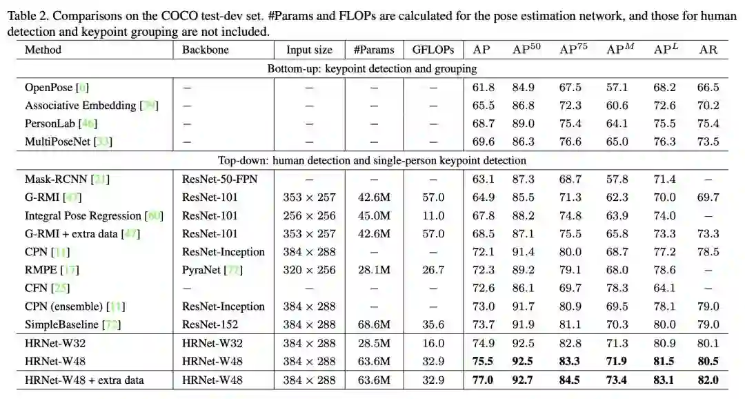 从上表可以看出 HRNet 均要高于其他自底向上的方法,无论是小型网络 HRNet-32 还是大型网络 HRNet-48 均较 Simple-Baseline 有 1.2 到 1.8 倍的提升。