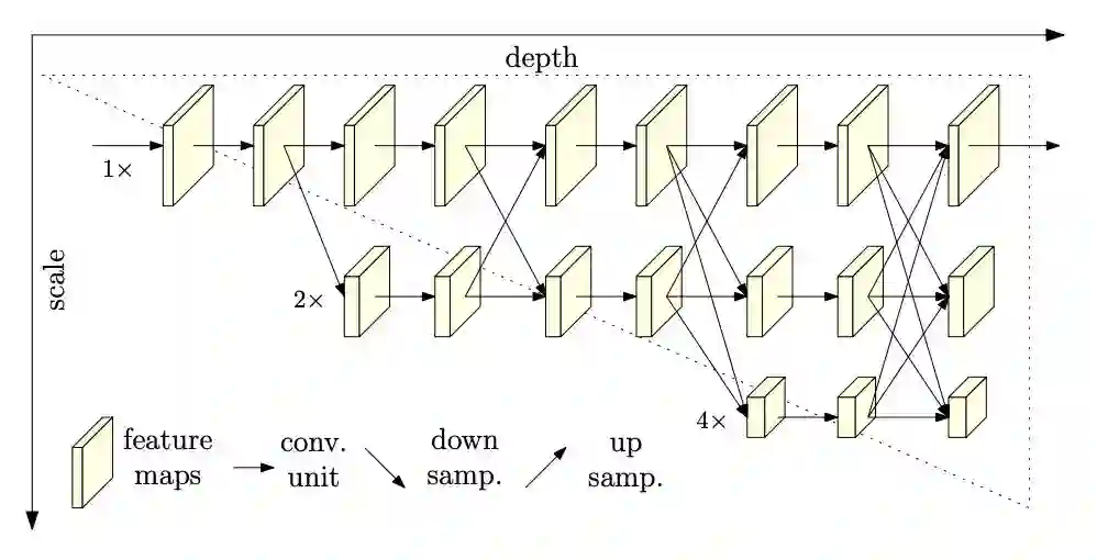 从左到右是高分辨率、中分辨率和低分辨率的信息融合方式,这种融合方式统一交给“交换块”完成,其实也就是相应比例上、下采样的统称。