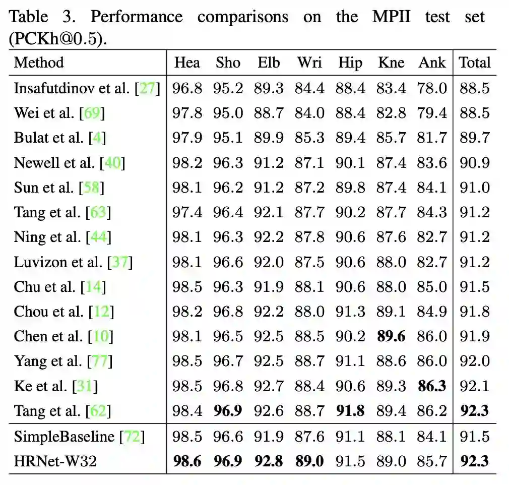 除此之外,在 MPII 姿势估计数据集上的结果如下表: