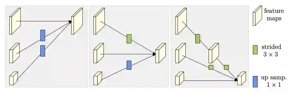 虽然每条子网络内部特征图会接受来自相邻子网络上层特征传递给他们的其他尺度信息,这样的交叉特征融合怎么进行的呢?其分为三种情况,如下图所示: