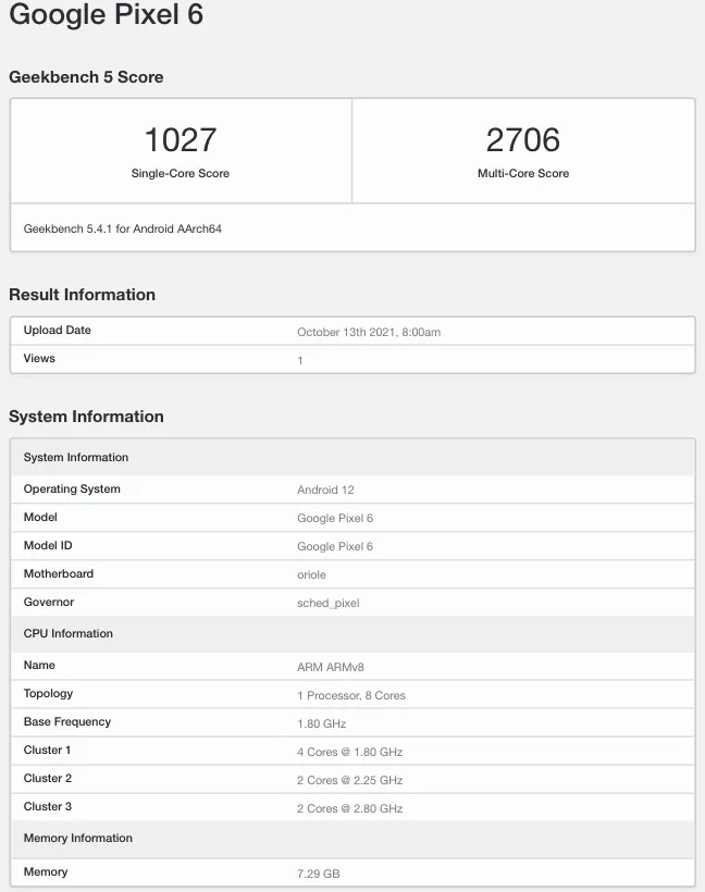 据 Geekbench 信息显示,谷歌 Pixel 6 配备 8GB RAM,搭载 Android 12 操作系统,单核跑分 1027,多核跑分 2706。此外,该机还拥有 Mali G78 GPU。
