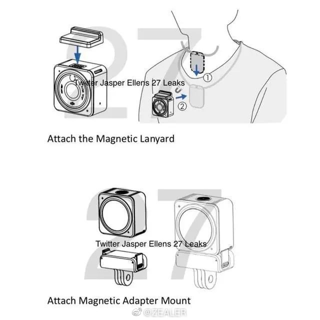 另外,大疆 Action 2 运动相机的用户手册和真机图也被 Jasper Ellens 27 曝光。本体非常小巧,参数上看仅重 56g,但支持 4K60fps 视频录制。此外,机身底部还有触点,也对应了预热海报中的第二部分,从手册中看应该可以通过卡扣拓展外接屏幕?电池?甚至通过连接器戴在胸前录制。