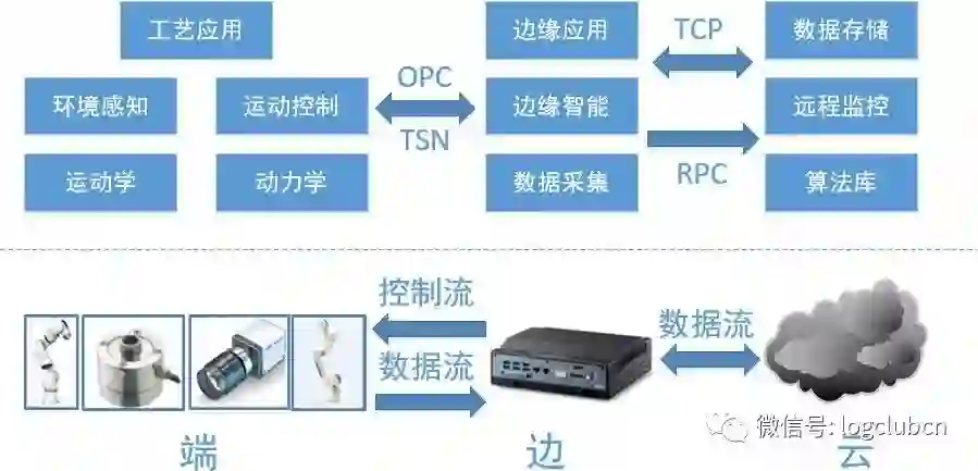 如上图所示,边缘智能部署在边缘计算设备上。与端设备,采用的 TSN 硬件协议与 OPC 应用协议,最大限度保证了 IT 与 OT 的通信实时性与效率。与云设备,则是采用了 TCP 传输数据与 RPC 进行远程调用,保证了数据传输的安全稳定性,降低云端与边端之间的通信开发难度,提高系统稳定性与扩展性。