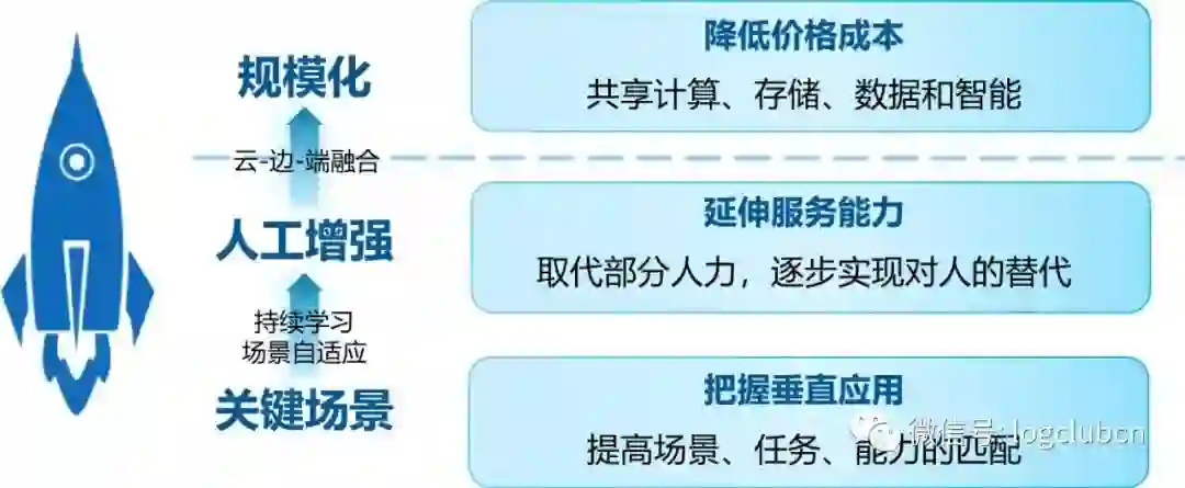 类似互联网的三级火箭发展模式,第一阶段——关键场景,把握垂直应用,提高场景、任 务、能力的匹配,提高机器人在关键应用场景的能力,扩大用户基础;第二阶段——人工增强, 通过加入持续学习和场景自适应的能力,延伸服务能力,取代部分人力,逐步实现对人的替代, 让机器人的能力满足用户预期;第三阶段——规模化,通过云-边-端融合的机器人系统和架构, 让机器人达到数百万千万级水平,从而降低价格成本,实现大规模商用。