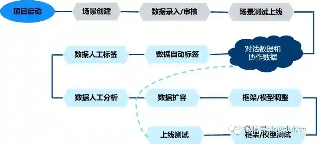 对于智能对话任务,在产品化项目测试完成后,整个系统将进行上线。接下来,伴随着客 户对产品的使用,将产生大量的对话数据和协作数据,这些数据都将导入到云平台的数据库中。随后,数据平台将提供接下来的技术和流程界面支撑,包括数据自动标签,数据人工标签,数据人工分析,数据扩容,框架/模型训练,框架/模型测试相关模块,从而达到整个系统知识库的完善,模型场景精确度提高,框架合理性技术提升,系统的智能进化,最终客户满意度的持 续提升。