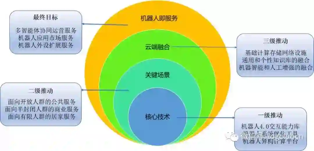 在机器人 4.0 演进过程中,要摆脱线性思维,建立跳跃式发展框架。具体来说,人工智能和人工增强要按需融合,在核心技术逐步演进过程中,从优化垂直应用场景入手,率先在关键场景为用户提供稳定可靠的服务。在 5G 通信技术的支撑下,本地数据采集和云端知识共享应高效连接,通过不断延伸服务场景,逐步减少人工增强的比例。在共享计算、存储、通信资源基础上,智能算法持续从(云端)大数据和(本地端)个性化数据中抽取知识,逐步从特定场景适应到通用场景,最终实现机器人即服务(Robot As A Service)的长期愿景。下图描述了面向“机器人即服务”的协同创新框架,包含四个跳跃式发展的阶段,以及每个阶段的主要任务和目标。