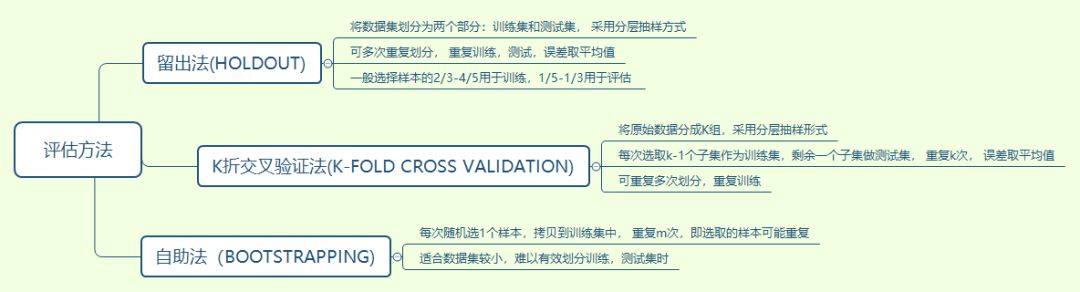 常见的模型评估方法有留出法,k折交叉验证法和自助法: