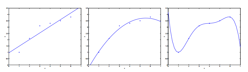 我们希望的状态是模型能训练出数据的一般规律,既不过拟合,也不欠拟合。如下图所示,最左侧可能是一种欠拟合状态,拟合的函数和训练集的误差较大,最右侧是过拟合,拟合的函数与训练集几乎完全匹配,这种情况在测试集中结果反而会变差。由此,需要构建评估模型来评估模型的泛化能力,这是检验一个模型是否更为有效的方法。