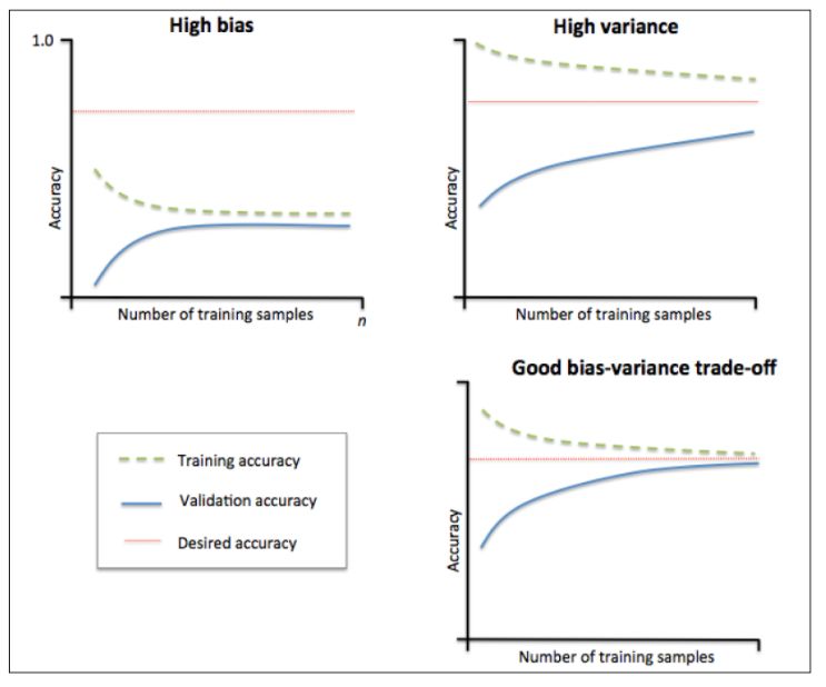 当训练集与测试集的误差收敛但却很高时,为高偏差,左上角偏差较高,训练集和验证集的准确率很低,可能是欠拟合。当训练集与测试集的误差之间有很大的差距时,为高方差,右上角中方差较高,训练集的准确率要高于验证集的准确率,可能是过拟合。理想的状况是偏差和方差都很小,此时既不欠拟合也不过拟合。
