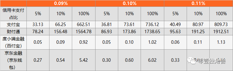 由于国内持有信用卡的人数占比不高,京东和度小满信用卡还款产生的成本相对有限。根据央行Q3支付报告,人均持有信用卡占银行卡数的8.85%,笔者对信用卡支付占比设定为5%、10%。以微信为例,如果通道费率为0.09%,信用卡占比为5%、10%,微信可以通过手续费获得8.69亿、17.39亿元;如果通道费率为0.11%,信用卡占比为5%、10%,微信需要进行补贴。