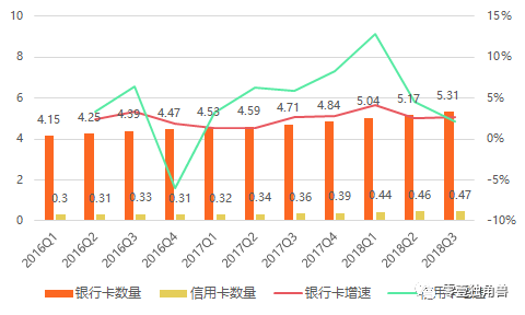 对于信用卡来说,国内持有信用卡的人数显上升趋势,但是持有率仍然较低。2018年底,中国人民银行发布的2018年三季度支付体系报告(下文简称“央行2018Q3支付报告”)显示,中国人均持有银行卡5.31张,其中人均持有信用卡0.47张。人均持有信用卡数量的增长速度在2017Q1-2018Q2高于银行卡后,在2018Q3出现了回落。
