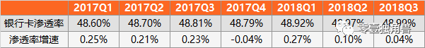 中国银行卡渗透率逐年提高,2018年第三季度渗透率为48.99%,中国银行卡消费总量累计超过了24.05万亿元。