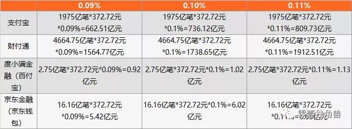 因为支付宝和微信给出的信用卡手续费率为0.1%,所以笔者假设BATJ2018年支付方式中信用卡占比为100%,成本费率分别为0.09%、0.1%、0.11%,每笔支付金额为372.72元(见表4)。当通道成本费率为0.09%时,收到的手续费大于成本,支付机构从中可以获得收入。当通道成本费率与手续费率相等时,支付机构收入覆盖成本。截至3月9日,微信是唯一一家收费的机构。根据上述假设条件测算,微信信用卡还款手续费收入1738.65亿元,如果成本费率为0.09%,财付通可以获得173.86亿元的差价。支付宝、度小满、京东在2018年没有对信用卡还款收取费用,假设支付通道成本费率为0.09%,那么上述三家公司需要对该项业务分别补贴662.51亿元、0.92亿元以及5.42亿元。