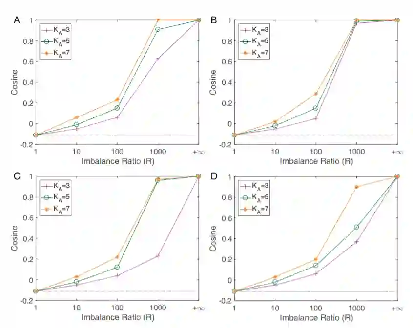 Figure 3深度神经网络中的非均衡坍缩现象,横坐标R代表类之间样本数的比例,纵坐标代表样本数较少的类的最后一层特征之间的方向的余弦值。可以看到随着R从1增加到无穷大,这些样本数较少的类的特征从神经坍缩中最大化两两之间夹角的方向逐渐被挤压到相同的方向。ABCD四张图分别是VGG和ResNet两种网络结构在Fashion-MNIST和CIFAR10两个数据集上分别的结果。