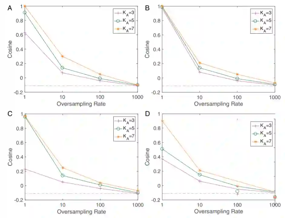 Figure 4 重采样技术对于网络最后一层对称性的修复作用。可以看到随着重采样比例逐渐接近类之间的样本数比例,数据集不平衡造成的对称性破坏被重采样逐渐修复,最终在两个比例相等时完美地重现了神经坍缩地几何结构。ABCD四张图分别是VGG和ResNet两种网络结构在Fashion-MNIST和CIFAR10两个数据集上分别的结果。