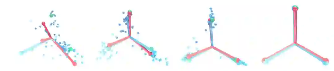Figure 2 神经坍缩现象的图示,红色棍代表最后一层分类器的方向,蓝色棍代表最后一层特征的平均值方向,蓝色小球代表最后一层的特征向量,绿色小球代表简单等角紧框架的方向,从左至右代表网络训练的过程,可以看到随着训练的进行,网络最后一层的特征与分类器都逐渐收敛到了简单等角紧框架的方向。