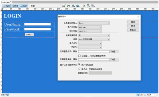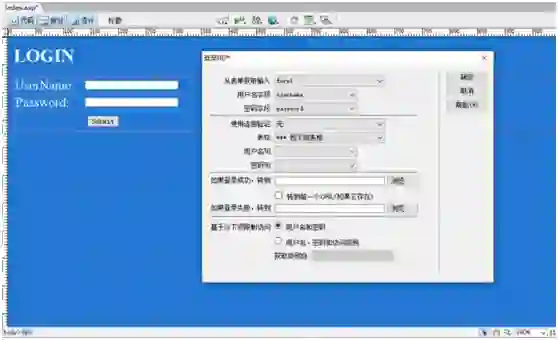 下图是笔者使用 DreamWeaver 来生成一个简单的登录模块,只需要设定一下数据表字段,即可生成表单,完成登录判断和跳转功能。
