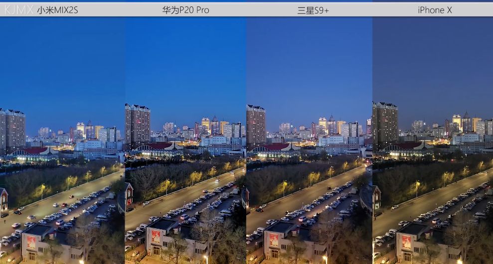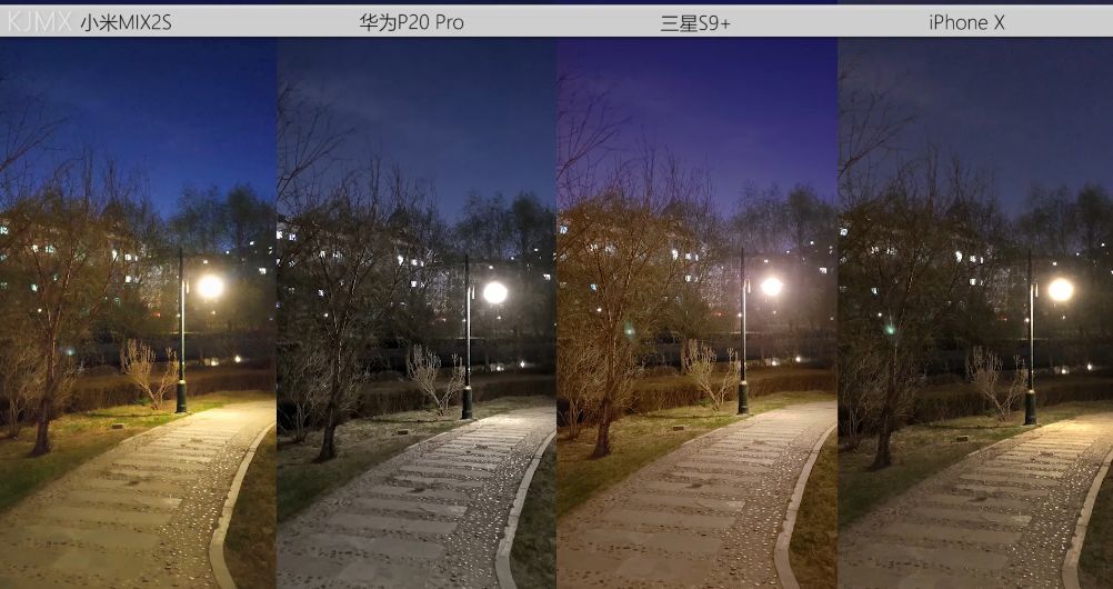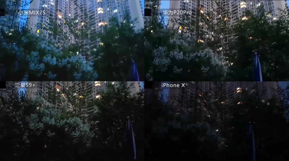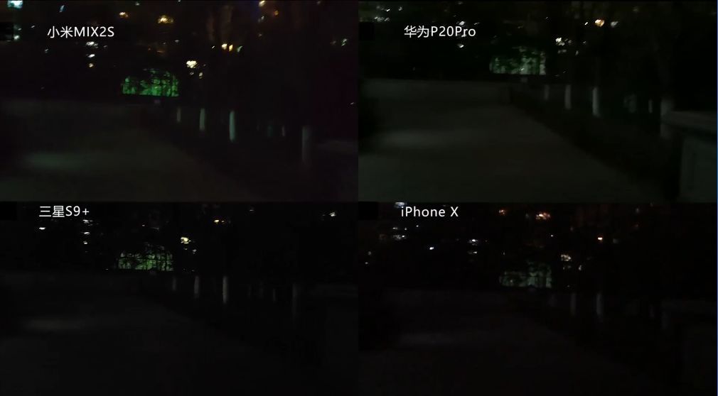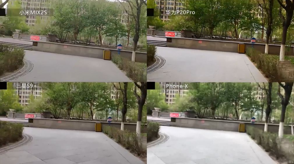 晚上的时候,MIX 2S取景亮度最高,但是偏色和涂抹感比较严重。P20 Pro和Galaxy S9+的视频风格和照片一样,并且伴有拖影的现象。