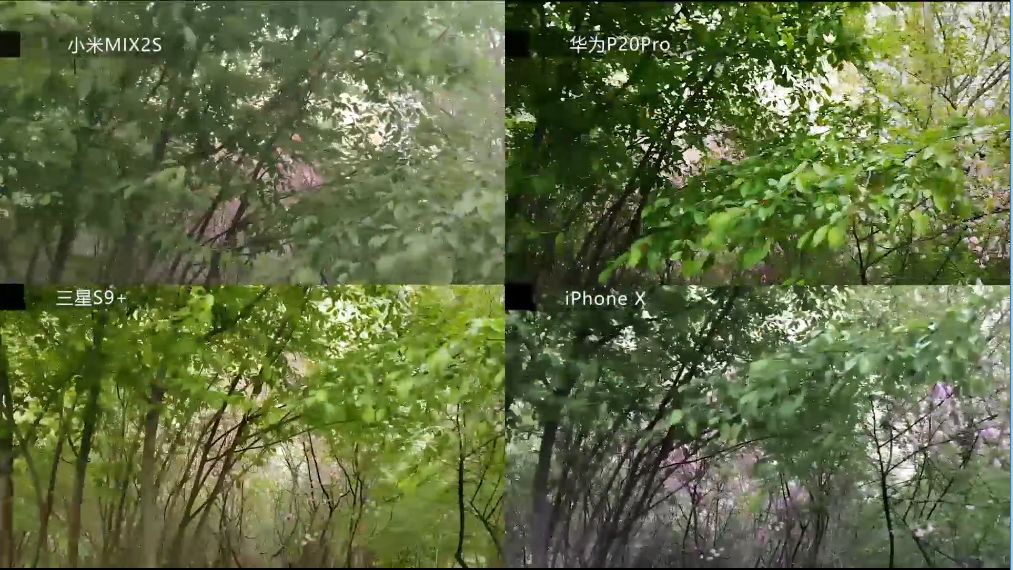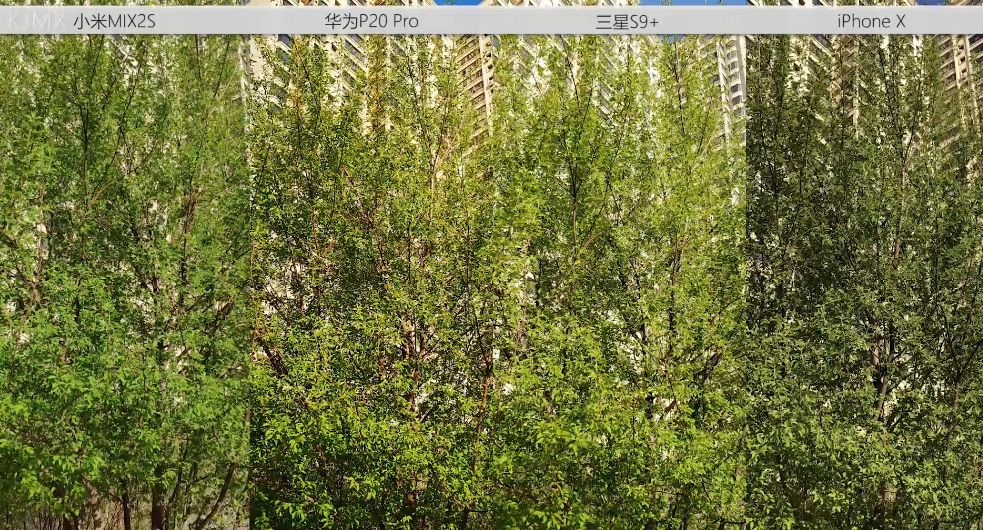 这次的场景是大片的绿色。MIX 2S翠绿的树叶更像7、8月的样子,P20 Pro还是老毛病,发黄比较严重,Galaxy S9+才是北方刚刚入夏的时候。不过排名MIX 2S、P20 Pro和Galaxy S9+分别1、2、3位。