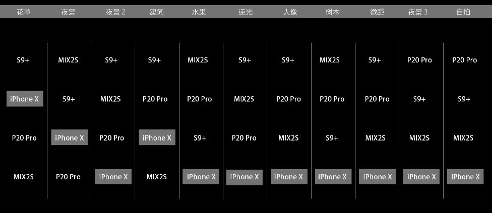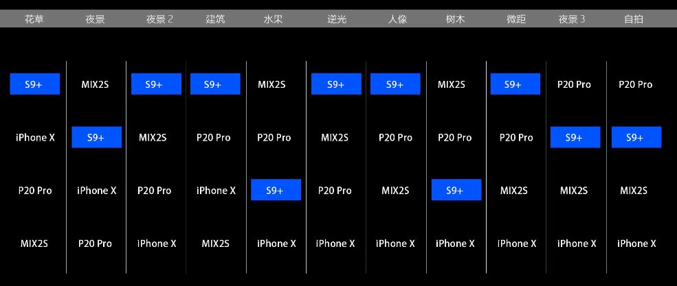 广角方面,Galaxy S9+和MIX 2S的等效26mm居首,取景范围比等效27mm的P20 Pro多出一段,等效28mm的iPhone X排在最后。