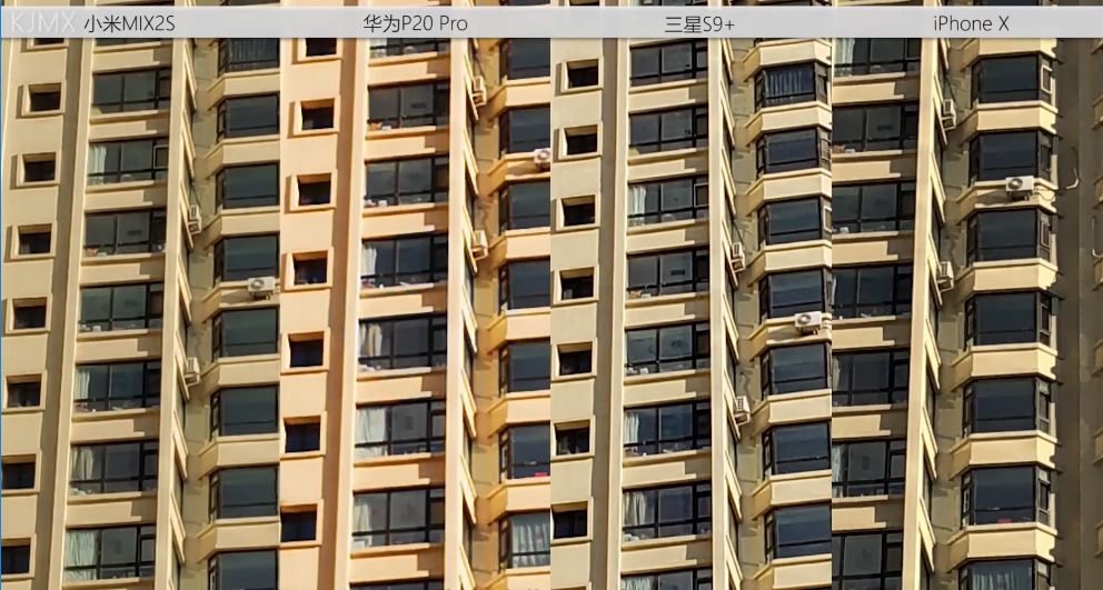 但是P20 Pro过于锐化的痕迹开始凸显,我们放大来看,P20 Pro显的脏乱不已,几乎没有什么细节。Galaxy S9+比较平衡,基本照顾光线条件不理想的注意事项。MIX 2S对于一些浅色的噪点控制不如Galaxy S9+,而且边缘画质降低,拍摄当天的时候应该是iPhone X的样子,而且iPhone X没有过分的锐化和涂抹,保留的细节也更多,只是大家都不喜欢。